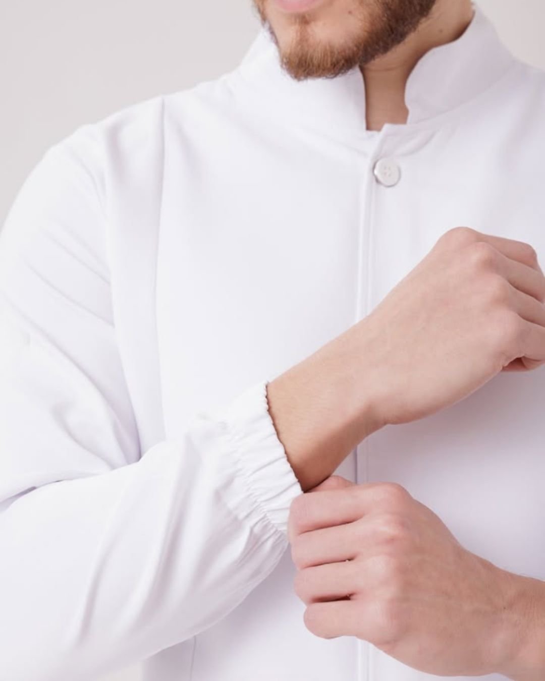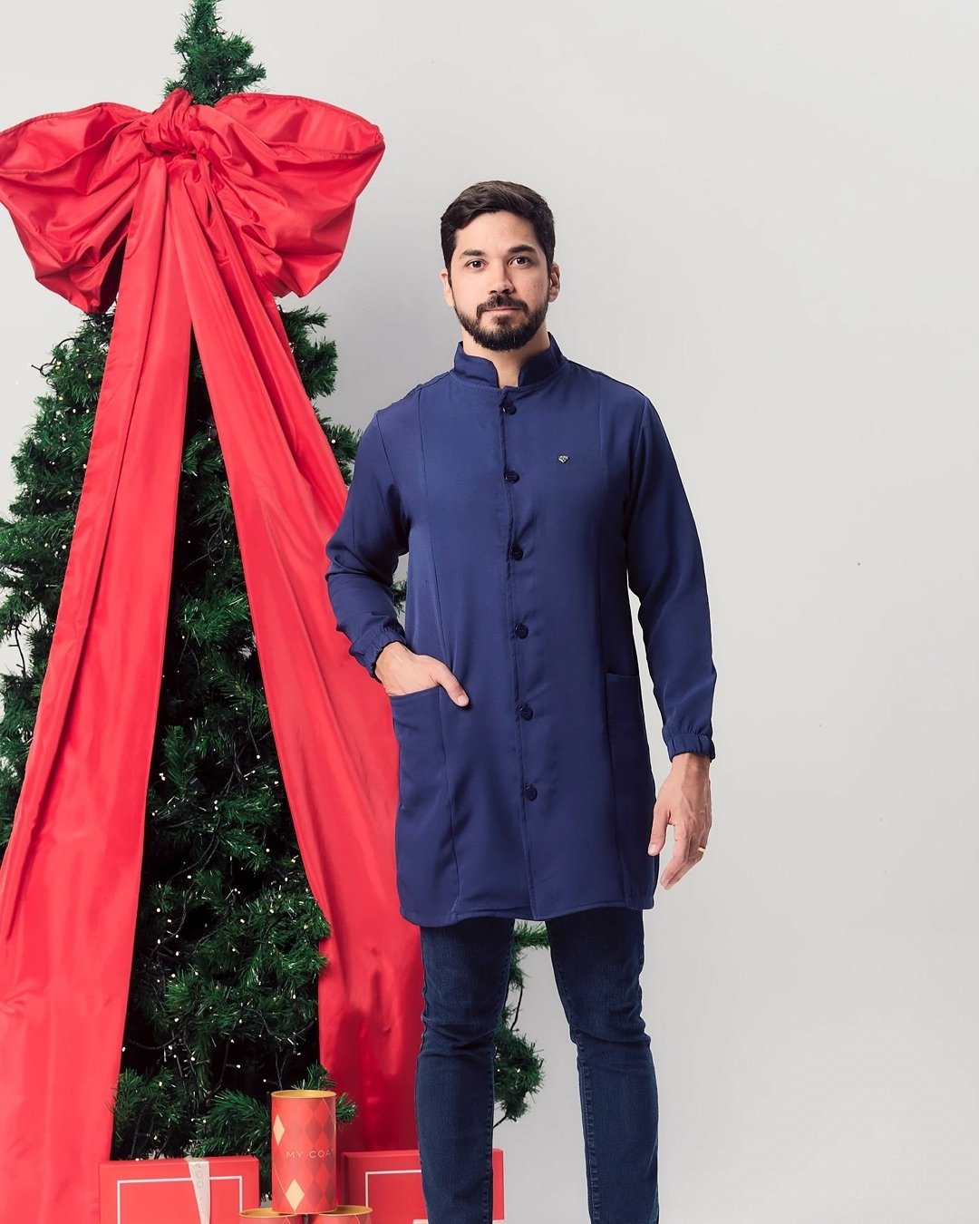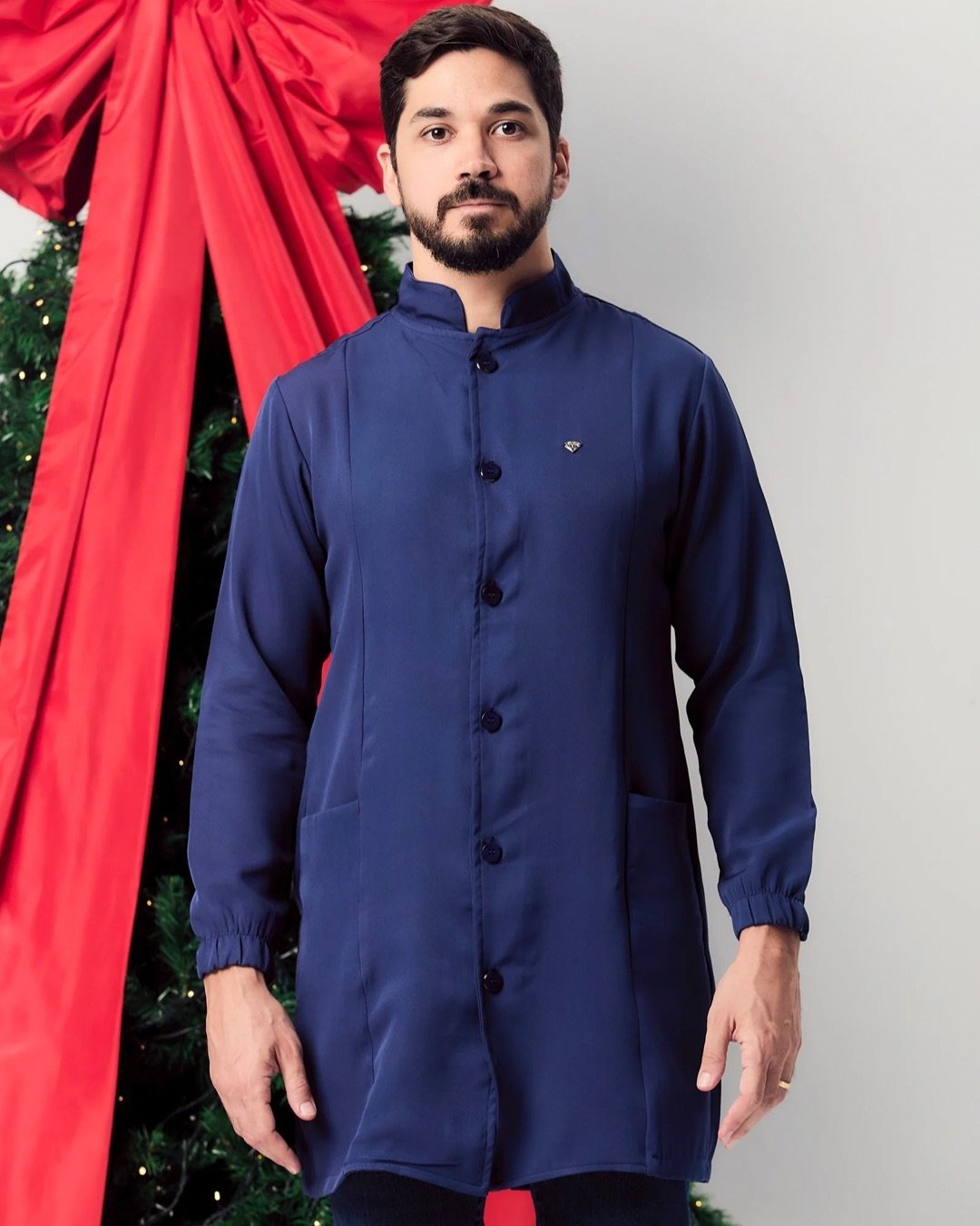 GOLA PADRE, MANGA LONGA, ELÁSTICO NO PUNHO, FECHAMENTO EM BOTÕES COBERTOS NO MESMO TECIDO E BOLSOS FRONTAIS.